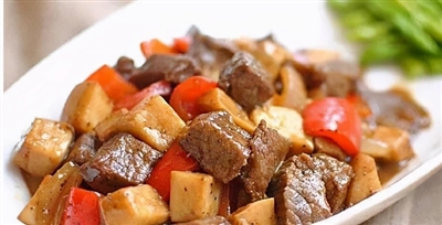 6.放入切好的苹果粒继续煸炒,最后撒入黑胡椒粉翻炒至汤汁收干即可。
