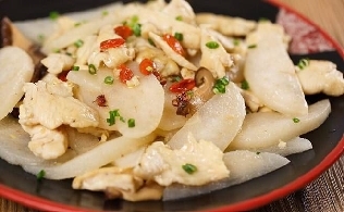 材料:鸡脯肉、梨、枸杞、葡萄干、盐、糖、食用油、味精、料酒、姜粉、胡椒粉、淀粉