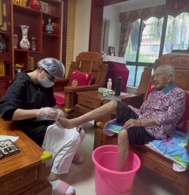 6月8日下午3时,家住长沙市天心区桂花坪街道银桂苑社区银桂小区的程宝贵正在给婆婆刘凤维擦洗。洗脸、擦洗身体、换衣服、泡脚……只见程宝贵娴熟地忙碌着,半个小时后,老人出现在众人前,已经是上身红花衣、下身咖色裤,一头白发往后面梳着,十分干净。今年92岁的老人显得精神矍铄。