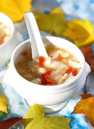材料:银耳20克,鲜百合10克,枸杞1小匙,红枣3个,冰糖1大匙