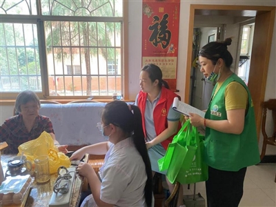 活动当天,社工与养老中心人员、志愿者等来到老人家中,简要介绍和沟通后,医务人员就为老人们进行量血压、测血糖等基础检查,并询问老人的病史、用药情况、日常生活习惯,提供饮食指导、健康护理、慢性病健康宣教等服务。针对患多种疾病或检查结果异常的老人,医生仔细查看其服用的药物,一对一进行用药指导,特别是一些常年卧病在床的老人,给予照顾者在家庭护理方面的建议和现场培训,促使其掌握相应的护理技巧,增强其照料能力。同时,社工、居民志愿者和老人进行交谈,询问他们目前的身体状况与生活状况,并进行情绪疏导,给予情感关怀。“我的身体不太好,出门又不方便,幸好有你们!”80岁的潘娭毑对社工与医生说道。