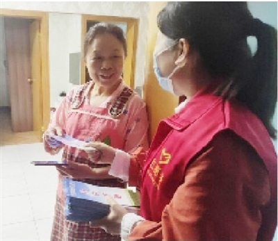 “杨奶奶,这是社区发的一份垃圾分类知识宣传资料,您在家可以按这个上面的图片,了解垃圾分类的相关知识,也可以了解一下为什么要进行垃圾分类。”社区党员志愿者祝晶敲响了居民杨奶奶的家门。