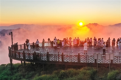 7月23日清晨,永州市蓝山县云冰山风景区,游客在观看日出。进入暑期,该县云冰山、百叠岭、湘江源国家森林公园等自然风景区景色秀美、气候宜人,迎来不少省内外游客开启夏日“避暑游”“生态游”。 通讯员 彭华/摄