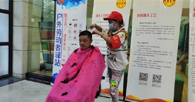 为进一步关爱新就业形态劳动者、户外劳动者,长沙市芙蓉区五里牌街道五里牌社区工会联合会发出清凉“邀请函”,在社区工会户外劳动者服务站点为奋战在一线的外卖员、快递员、环卫职工免费理发。
