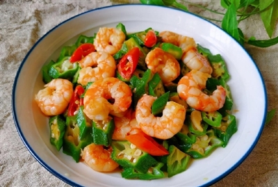 材料:秋葵、鲜虾适量,蒜末、盐、食用油少许