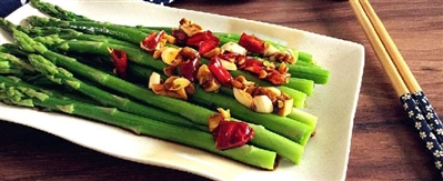 材料:芦笋300克,盐、味精、芝麻油、食用油适量