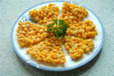 3.将玉米粒均匀裹上玉米淀粉后,烧油五成热放玉米粒,用锅铲铺满整个锅底;