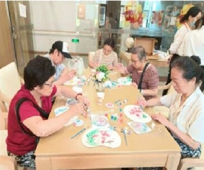 随后,老人们在颐养院老师的带领下做起手工团扇来。手巧的娭毑们负责扎丝带绑扇面,会绘画的娭毑们则负责上色调色,书法好的老大爷拿起狼毫一挥,题起字来……老人们认真参与,个个乐在其中。