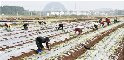 11月21日,江永县潇浦镇上界头村供港蔬菜基地,村民在栽种包菜苗。近年来,该县采取“党支部+合作社+公司+农户”模式,通过发展白菜、包菜、莴笋等蔬菜产业供应粤港澳大湾区,提稳“菜篮子”、找到致富路。田如瑞 摄