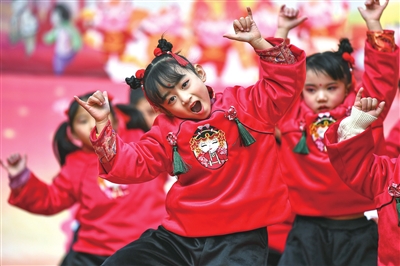 张家界第一幼儿园的孩子在表演舞蹈《属我最牛》。近日,该园举行“体验民俗乐 欢度中国年”活动,学生们在感受传统文化魅力的同时,用自己的方式迎接2021年的到来。