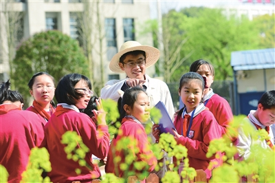 雨过天晴,春暖花开。长沙市芙蓉区东郡二小的教学楼前,一片油菜花开得正盛,而这片油菜花田是由东郡二小的孩子们种植的。3月13日,学生们与湖南省农业科学院的专家一起寻找花田里的自然秘密。 杨乔柔 摄影报道