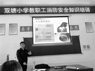 为更好地做好学校安全工作,让师生掌握一定的消防常识及灭火、疏散和逃生等技能,提高防范意识,确保学校安全,3月15日,吉首市双塘小学邀请了吉首市消防支队教官从火灾的危害、灭火的方法以及逃生的技巧三个方面,对全体教师进行了培训。