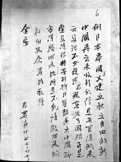 为了国家,凡是有志之男儿都应起来奋斗,打倒日本帝国主义,建立独立自由的新中国!再之未收到的信,是无关系的未之要话,不必复述。男现在为了国难正是紧要得很,非等到将日寇驱逐出中国,汝当得胜回来,此时是不能请假回来的,祈勿挂念。