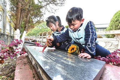 3月25日,张家界民族实验幼儿园的孩子们在为烈士墓碑描红。清明节临近,张家界市各中小学校组织师生到烈士陵园祭奠缅怀革命烈士,接受爱国主义教育。 邵颖 摄影报道