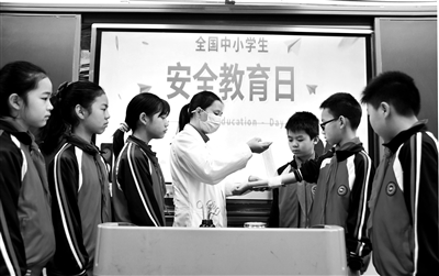 3月29日,医护人员向江永县实验小学的学生们传授急救包扎技巧。当日是“全国中小学生安全教育日”,该县各中小学校纷纷开展“知危险会避险、守护安全成长”主题活动,为学生们讲解急救处理、交通安全、灭火救援等知识,增强学生们的安全意识。 田如瑞 摄影报道