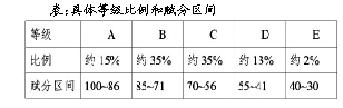 再选科目每科原始分满分为100分,转换时以30分作为等级转换的赋分起点,满分100分。首先,将每门选择考再选科目考生的原始分从高到低划分为A、B、C、D、E共5个等级,各等级人数所占比例分别约为15%、35%、35%、13%和2%,从而将考生的原始分转换成了等级。然后,将A至E等级内的考生原始分,依照等比例转换原则,分别转换到100~86、85~71、70~56、55~41和40~30五个分数区间(见下表),得到考生的等级分。转换基数为实际参加该科目选择考取得有效成绩的考生数。等级分计算结果按“四舍五入”的规则以整数呈现。