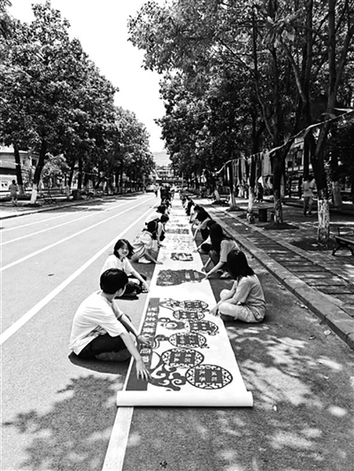 5月16日,师生在展示百米长卷剪纸作品《党史百年》。近期,郴州市海纳中等职业技术学校2名教师带领50余名学生精心筹备,选取了建党百年历程中45个重要的历史节点和重大成就,创作出45幅主题剪纸作品,组合成剪纸百米长卷《党史百年》,献礼建党100周年。 钟镭 摄
