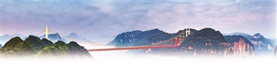 在湖南省湘西土家族苗族自治州吉首市的崇山峻岭间,有一座世所罕见的特大悬索桥,凌空飞架于大峡谷之上。每当薄雾升起时,深红色的桥身在虚无缥缈的云雾中若隐若现,宛如架在云端上的彩虹“天桥”,令人叹为观止。