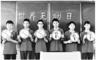 5月31日,江永县思源实验学校七年级学生在展示禁烟标识。当天是世界无烟日,江永县各中小学校开展形式多样禁烟宣传主题活动,呼吁人们远离烟草,倡导健康的生活方式,营造无烟环境。