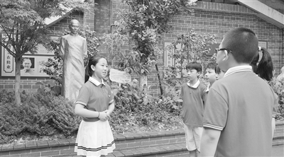 6月17日,记者来到修业小学,探寻校史中的红色密码。五甲班学生邬宛臻正落落大方地站在徐特立雕塑前,为前来参观的客人讲述徐特立的故事。作为学校的小小讲解员之一,她早已对学校的历史如数家珍。在她看来,故事里的伟人有血有肉,似乎就在自己身边。