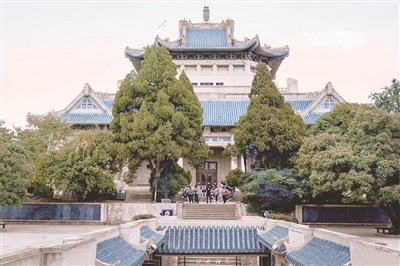 武大校园中最能体现校园自然风景与人文底蕴完美结合的,莫过于镶嵌在群峰翠谷的校园里的宫殿式建筑群了。其中最美观雄伟的传统建筑物,就是老图书馆。老图书馆始建于1933年,雄踞于狮子山顶,是一座皇冠形仿故宫建筑,庑殿顶、八角垂檐、大跨度空间,外部装饰极具中国传统特色,为武汉大学标志性建筑,同时也是校园制高点。老图书馆体量大,巍峨雄壮,北望东湖碧水,南与原工学院大楼遥相呼应,登顶鸟瞰,湖光山色尽收眼底。