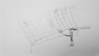 画面中,最醒目的部分是涂黑的房子,房子的屋檐上用封闭的线条框住了“家中无人”四个大字。“里面本来住的是老鼠,因为树上有个猫头鹰,所以老鼠都跑了。”小鹏解释说。