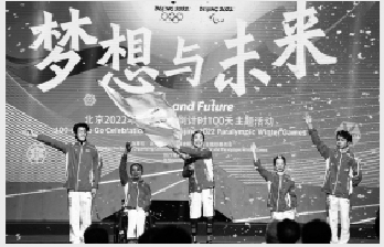 11月24日,北京2022年冬残奥会倒计时100天主题活动在北京举行,图为志愿者中的残疾人代表挥舞旗帜。