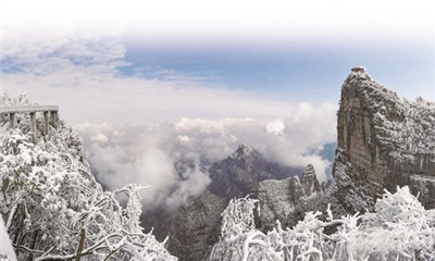 雪后的天门山玉树琼花,云海翻腾,满山雾凇,犹如仙境,呈现出一派南方雪国风光,蔚为壮观。天门山的最高峰云梦仙顶海拔1518.6米,它是一座天然的瞭望台,好似一座雪峰冰山,赫然林立在群峰之巅。雪中的天门山寺庄严端丽,浮于云海之巅,更添一丝禅意,一派天界佛国的祥瑞景象。