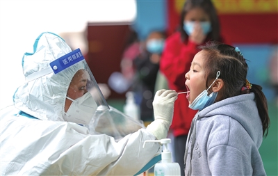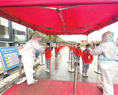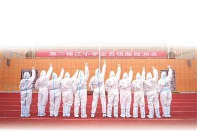 “天使白”坐定校园,采集核酸,保驾护航。“志愿红”护牢校园,群防群控,鼓劲加油。