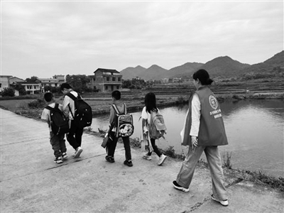 夕阳西下,衡阳县洪市镇余田小学教师每天护送学生回家。