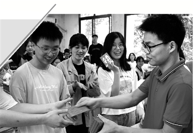 6月7日一早,浏阳三中考点,1912班班主任周红文手握一摞写着高考祝福的红包,“在考生进考场之前,一一发给每个学生。”周红文说,“我准备了一天一晚,提前写好激励祝福语放进58个创意金榜题名红包,里面还装有十元钱,寓意高考十全十美,愿同学们高考大捷。”