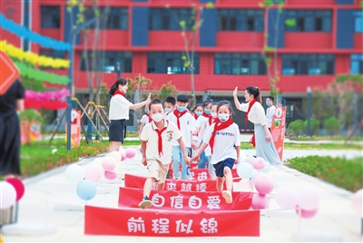 又是一年开学季。近日,湖南各中小学校相继开学,部分学校用仪式感满满的入学礼迎接“神兽”。图为长沙县湘龙二小学生开心跨过才智桥,并接受学校最真诚的入学祝福。 章帝 摄影报道