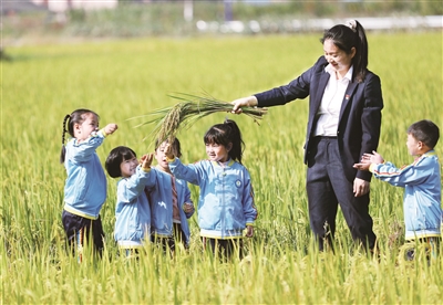 一粒米一滴汗,粒粒粮食汗珠换。10月16日是世界粮食日,宁远县九嶷山瑶族乡中心幼儿园把课堂搬到稻田里,开展珍惜粮食、认识稻谷等主题活动,培养孩子们爱惜和节约粮食的习惯。 郑明辉 摄影报道