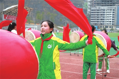 3月6日,学生在课后服务中打苗鼓。近年来,湘西土家族苗族自治州溶江小学把湘西苗族鼓舞、苗画引进课后服务课堂,丰富了学生校园文化生活,让他们感受到了非遗文化的魅力。 彭彪 摄影报道