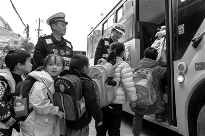 春季开学以来,通道侗族自治县交警部门严格落实“高峰勤务”工作机制,在学生上学、放学高峰等时段,加强值守,强化防控,做到重点学校门口“见警车、见警灯、见警察”,全面筑牢校园交通安全“防护网”。图为3月31日,该县菁芜洲镇中心小学,交警在引导学生有序乘车。
