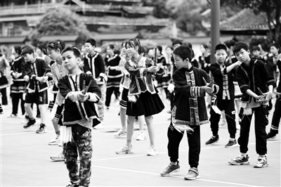 图为近日坪坦乡中心小学师生们在大课间活动上表演芦笙弹唱、哆耶舞。