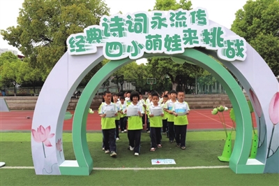 诗词积累,先行先试树典型。立校之初,学校便试行“经典诗词过级”项目,将传统文化与日常教学相融合,并开发了校本课程《经典诗文过级篇目》,让孩子们感受中华文化的博大精深。校本课程历经3次改版,囊括了259首经典诗文。学校通过每学期一次的经典诗文过级、闯关活动检验阅读成效。