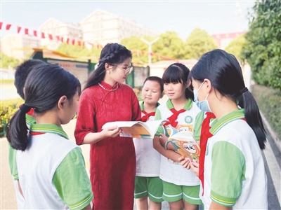 四(2)班语文老师陈晓昱也潜移默化地在学生心中播下了阅读的种子。在每周一节的读书分享会上,学生或进行诗歌朗诵,或进行读书分享。“起初,学生们很难用语言将读后感表达出来,通过丰富多彩的读书活动,他们能说了更能写了。”看着学生的变化,陈晓昱很是欣慰。