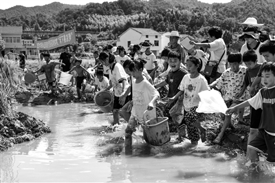 9月17日,浏阳市淳口镇山田新村,孩子们在收割完的稻田里徒手捉鱼,体验乡村生活乐趣,感受农耕文化魅力。