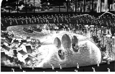 开幕式现场出现了杭州拱宸桥的形象。横跨运河的拱宸桥是京杭大运河南端的标志。由裸眼3D视觉技术构筑而成的拱宸桥跃然于运河之上,一岸连接古代,一岸通往现代。在AR技术加持下,寄托着古今美好心愿的灯笼升腾而起,融汇为点点星河流向远方。2014年6月,中国大运河成功申报世界文化遗产,拱宸桥作为运河水工建筑,成为一处遗产点。