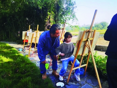 煦暖的秋阳穿透富民村德兴湖畔的小树林,疏影横斜在岸边的几条小木船上。旁边的草地上聚集着村里40多名留守儿童,他们或坐、或趴、或跪,姿势各异,手中的毛笔在画板上来来回回地皴擦,偶尔抬头讨论、嬉笑几句。62岁的许国良一脸欣慰地看着他们。