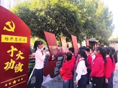 11月17日下午,金色的阳光照进开慧双拥社区公园,长沙市芙蓉区育华小学五年级(1)班的孩子们排着整齐的队伍,在老师和家长志愿者的陪伴下来到这里,8名来自育华小学六年级的小小讲解员饱含深情地向学弟、学妹们介绍着杨开慧烈士的事迹,孩子们静静地听着,“骄杨”精神就这样在他们心中深深地扎下了根。