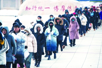 12月23日,2024年全国硕士研究生招生考试初试开考。寒风里考生们满怀希冀走进考场,奔赴这一场圆梦之约;教育系统全力以赴周密部署,以暖心服务助力考生顺利应考。图为考生在哈尔滨理工大学考点排队进入考场。