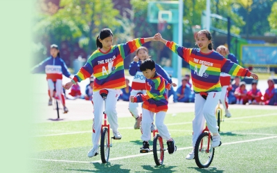 跑操、跳皮筋、扔飞盘、骑独轮车……课间,操场、教室、读书角、走廊、功能室等场所,处处都能见到放松休闲的学生们,笑声、闹声、欢呼声、助威声回荡在校园。