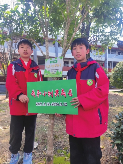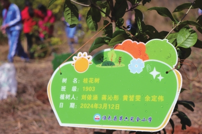 临武县六完小,新种的桂花树挂上标牌,特别鲜亮。 丁建兵/摄 |