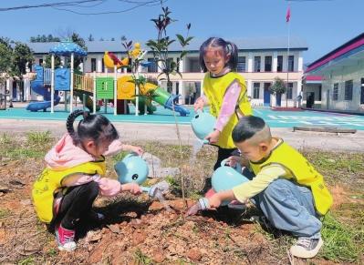 江永县夏层铺镇冷水铺中心幼儿园孩子们在给小树苗浇水。 田如瑞/摄 |