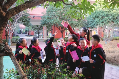 常德市鼎城区永安小学的孩子们在校园里捡拾落花、树叶,制作了护绿主题书签。 杨兰/摄 |