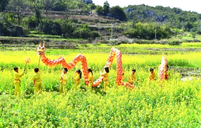 3月11日,农历二月初二,俗称“龙抬头”,江永县各学校举行丰富多彩、各具特色的活动欢庆民俗节日,让孩子在玩中感知民俗传统,激发对中华民族的认同感和自豪感。图为江永县松柏瑶族乡中心小学的学生表演舞龙。 田如瑞 摄影报道