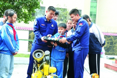 3月22日,蓝山县各中小学校50余名师生走进县消防大队,了解各类消防器材的用途和使用方法,学习消防安全知识。图为消防员指导学生体验如何操控无人救援机。 杨乐乐 摄影报道