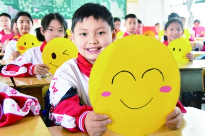 5月8日是“世界微笑日”,连日来,江永县各学校组织学生开展迎接“世界微笑日”活动,引导学生养成乐观向上的生活态度。图为江永县第一小学的学生展示笑脸卡。 田如瑞 摄影报道